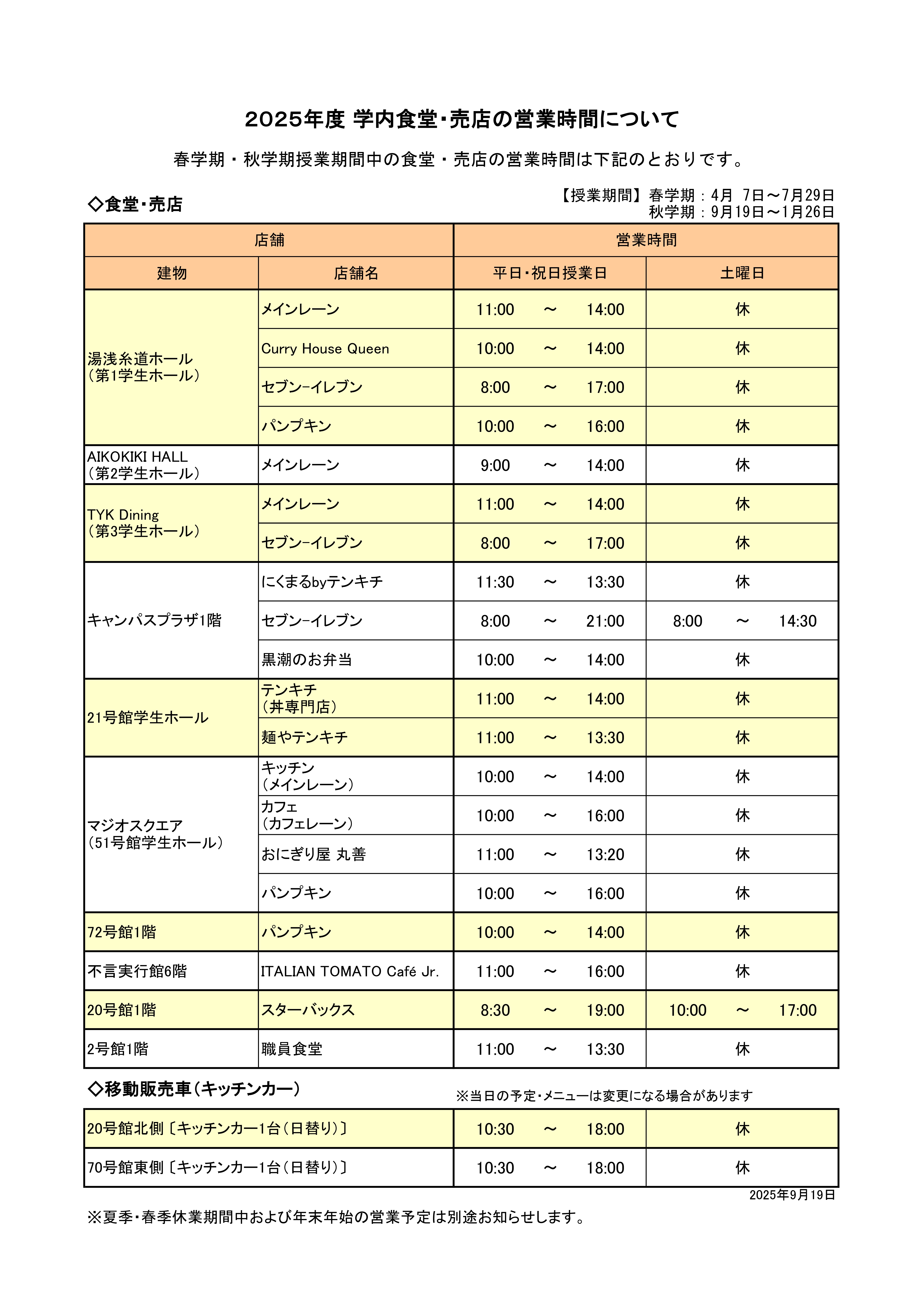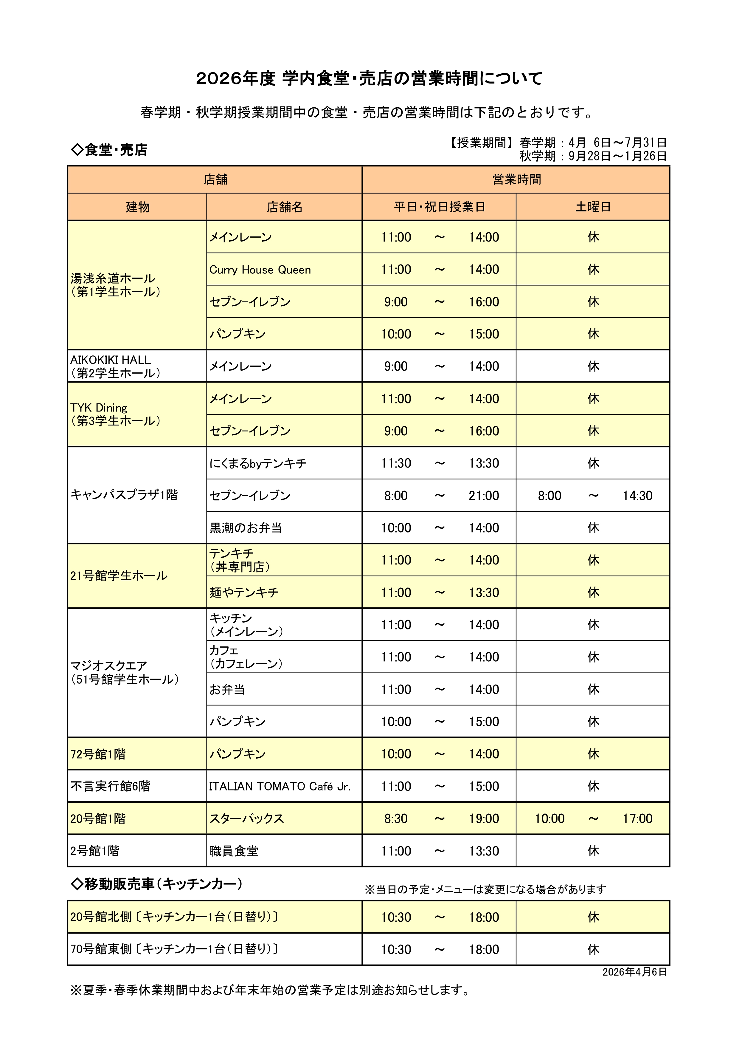 授業期間中の食堂・売店の営業時間は下記のとおりです。長期休業期間中および年末年始の営業予定については別途お知らせします。