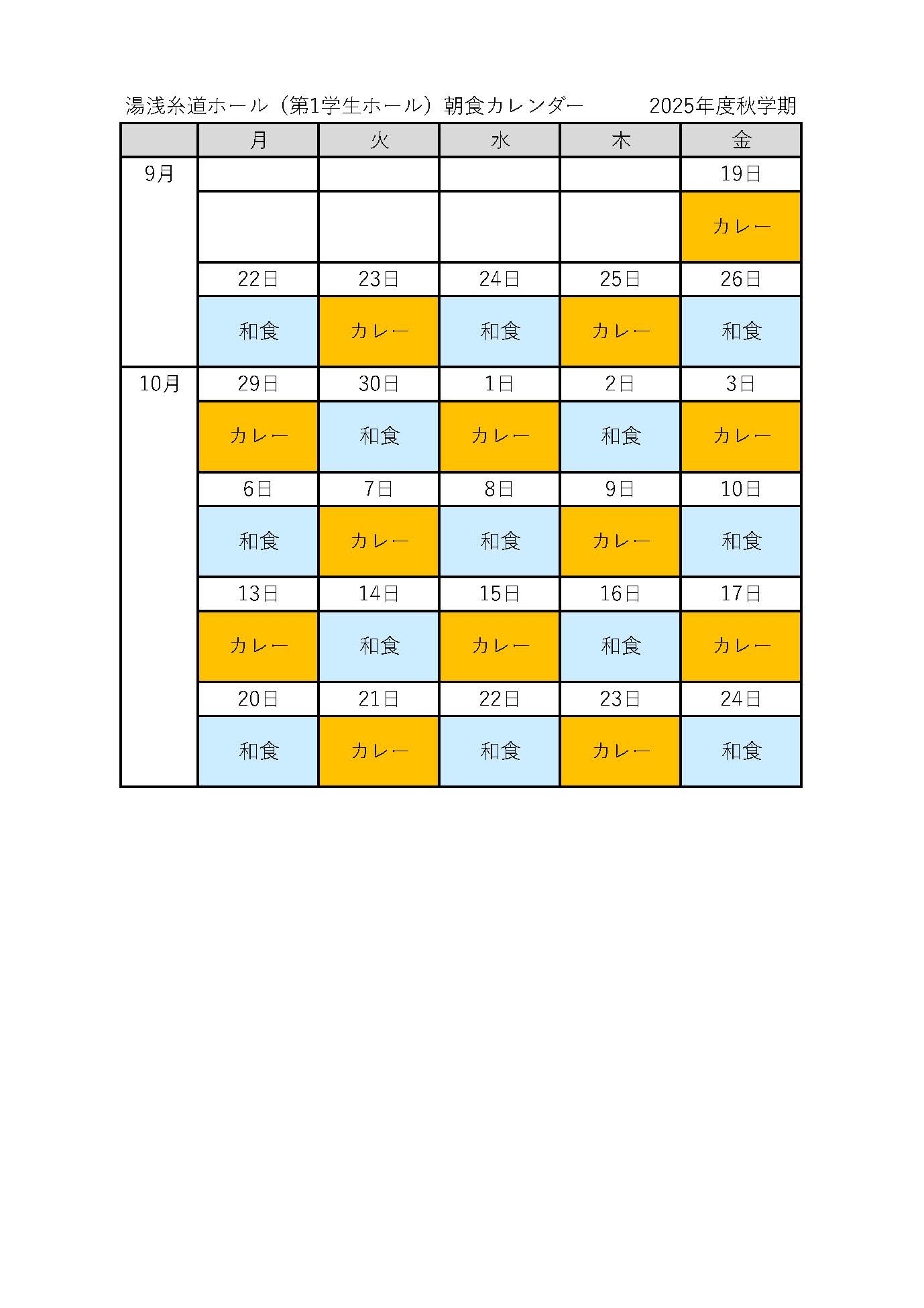 9月19日(金曜日)から10月24日(金曜日)の授業日