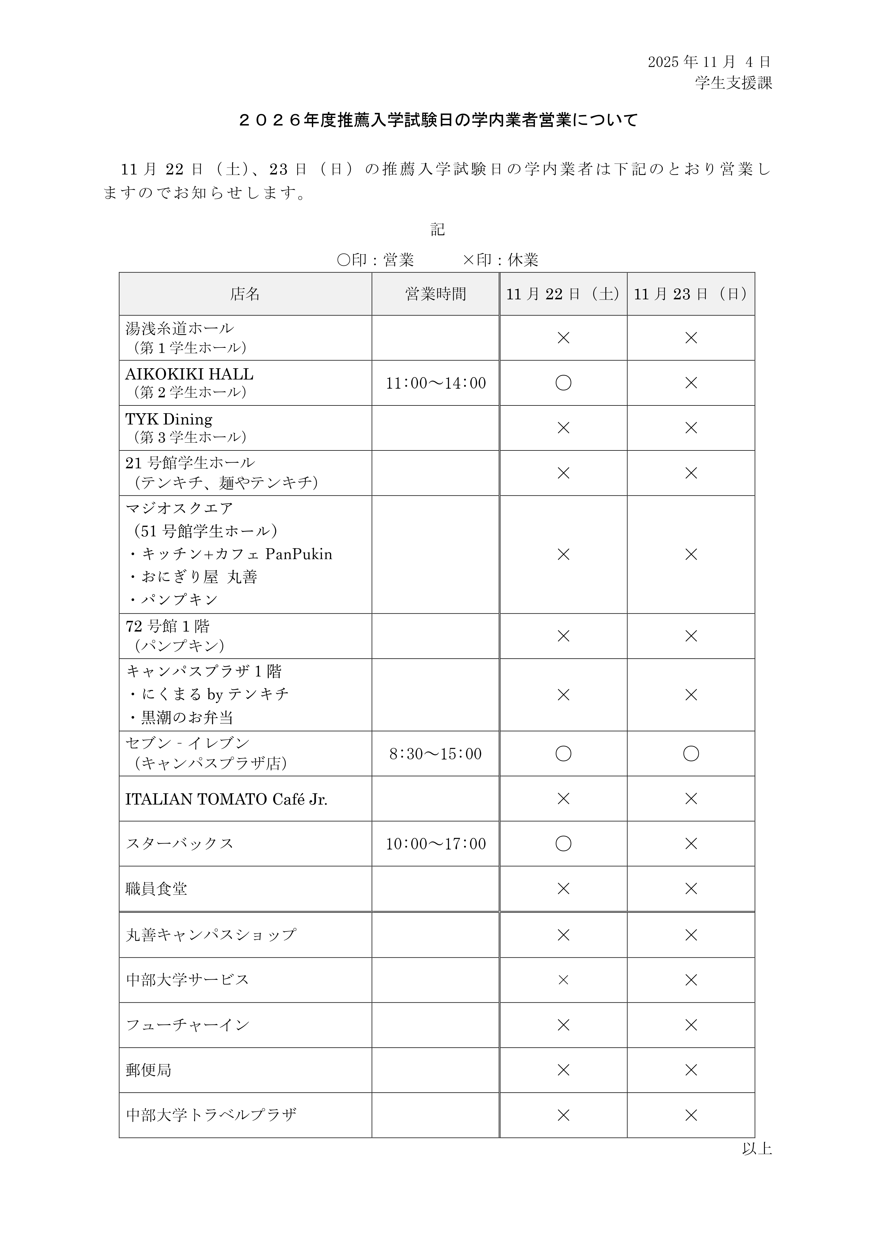 11月22日(土)、23日(日)の推薦入学試験日の食堂・売店・ショップは下記のとおり営業いたします。